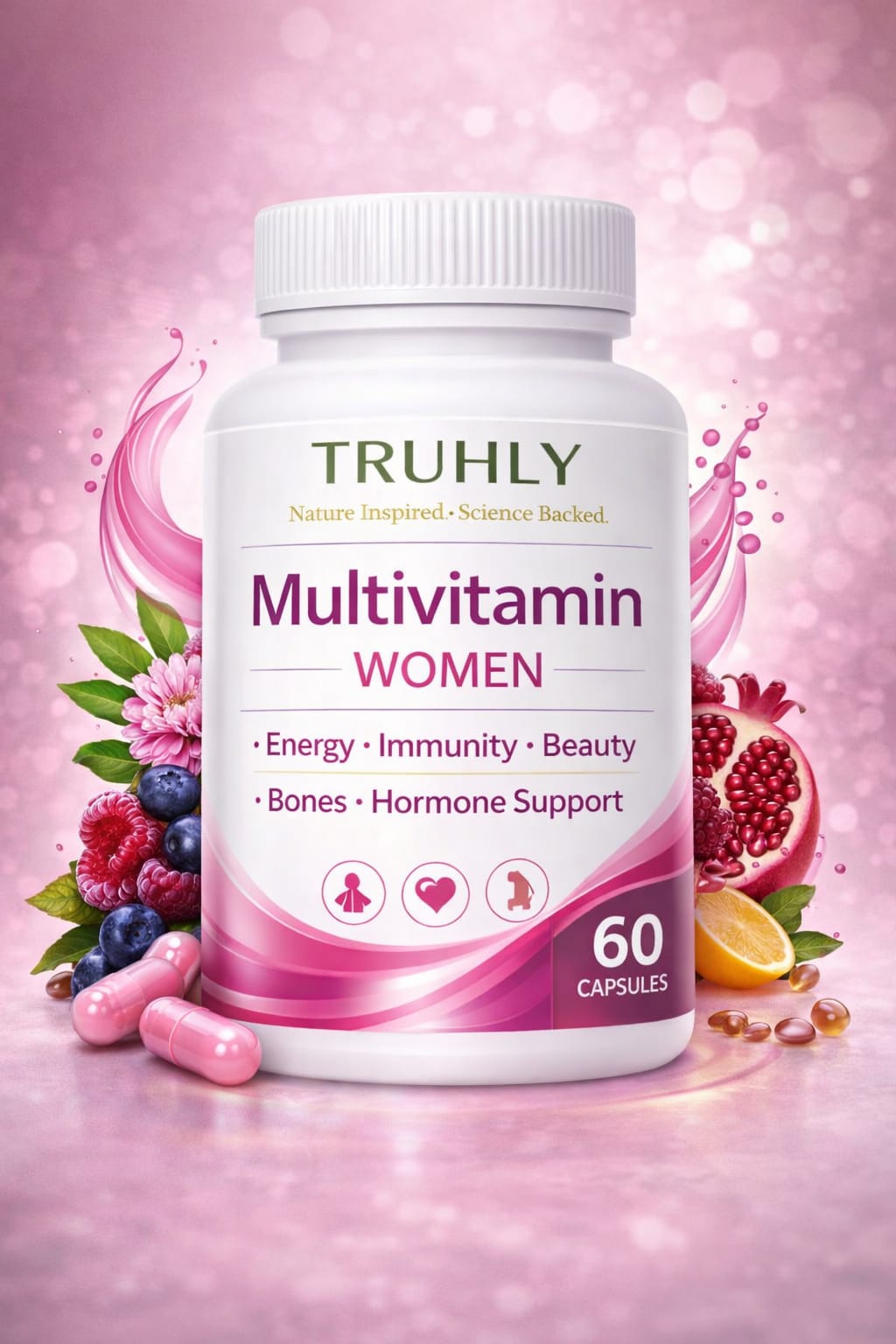 Packed with scientifically researched vitamins and minerals, these multivitamin tablets help nourish the body, boost energy levels, and support female vitality at the cellular level, promoting overall wellness and balance.